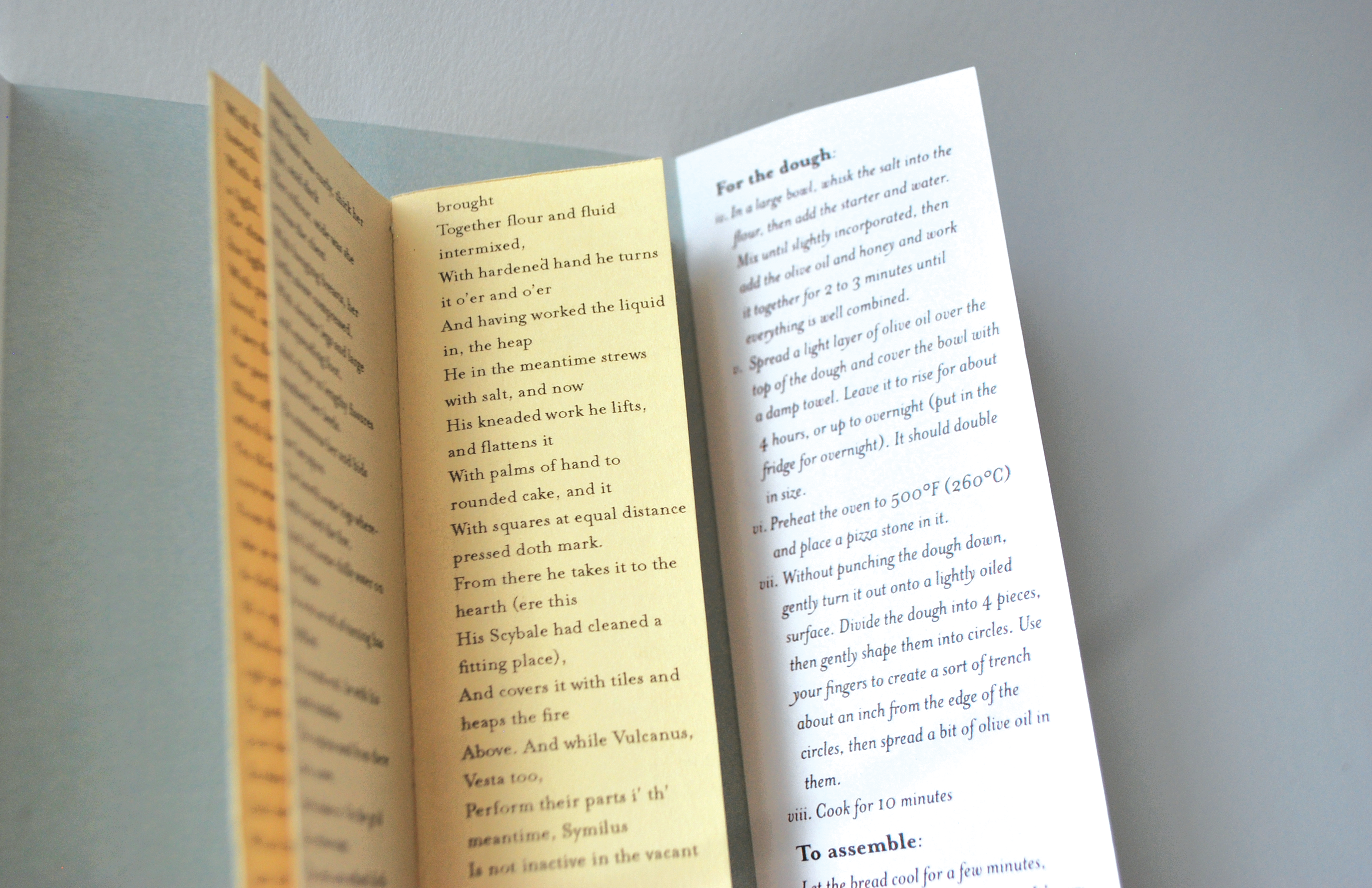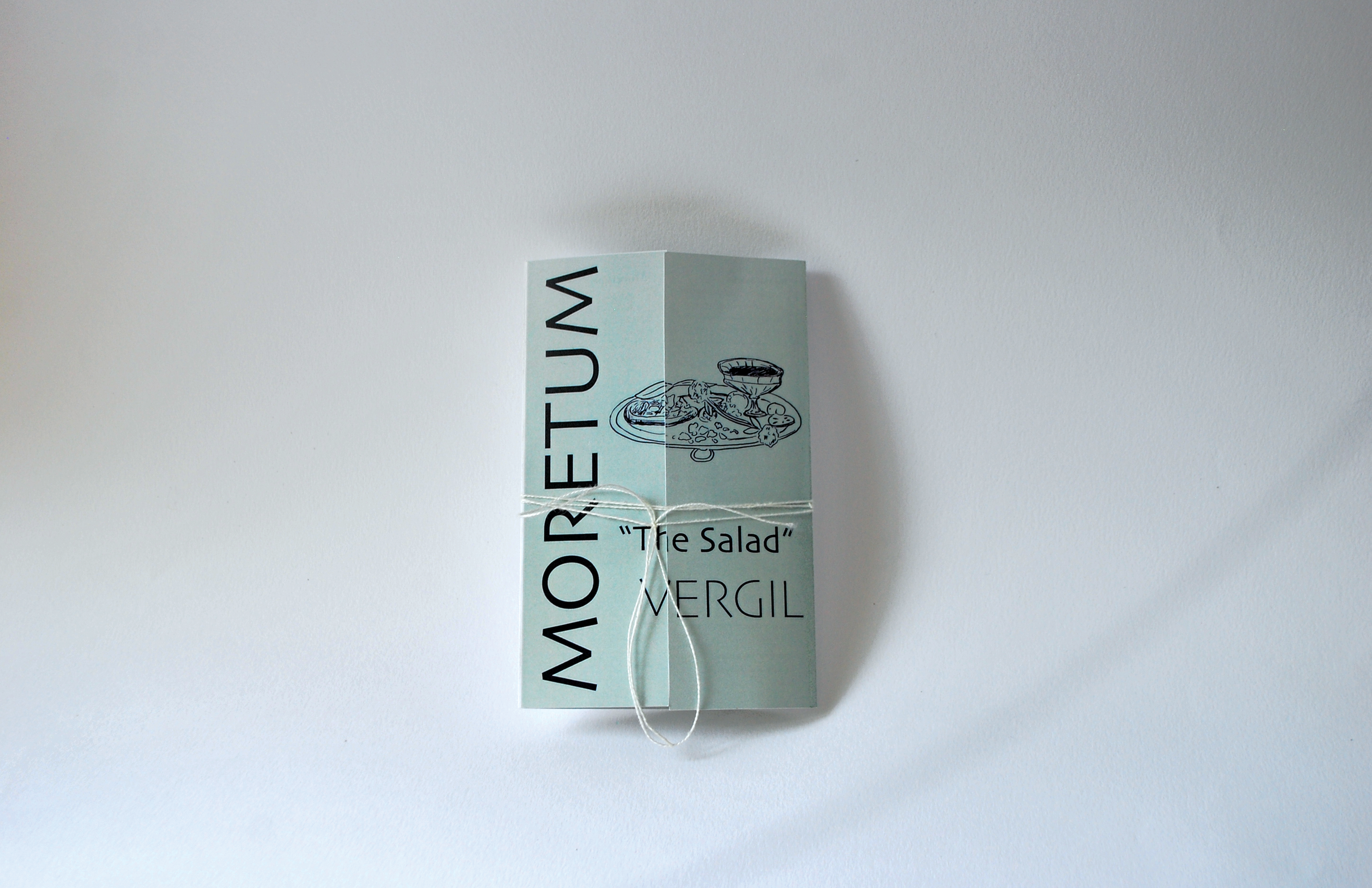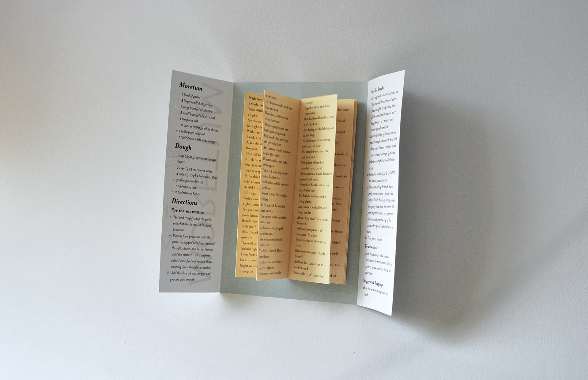Experimental Book. Recipe as interpreted through the latin poem Moretum by Vergil. Poem can be read in the center while the instructions for the recipe are on the sleeves.